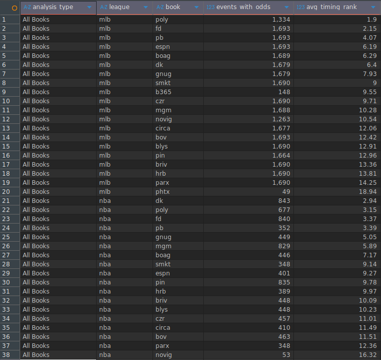 So with all of this data, my key finding is that assumptions that I’ve held and read about in multiple books and dozens of online communities can and are wrong to take at face value. Digging into the data shows that books perceived as being sharp, may only be sharp due to second (or 10th) mover advantages. I’m working on incorporating this type of data (e.g. how sharp is a book) into future functionality on the Oddizer side of Oddize, so stay tuned for more programmatic examples of how to use a book’s odds against them.